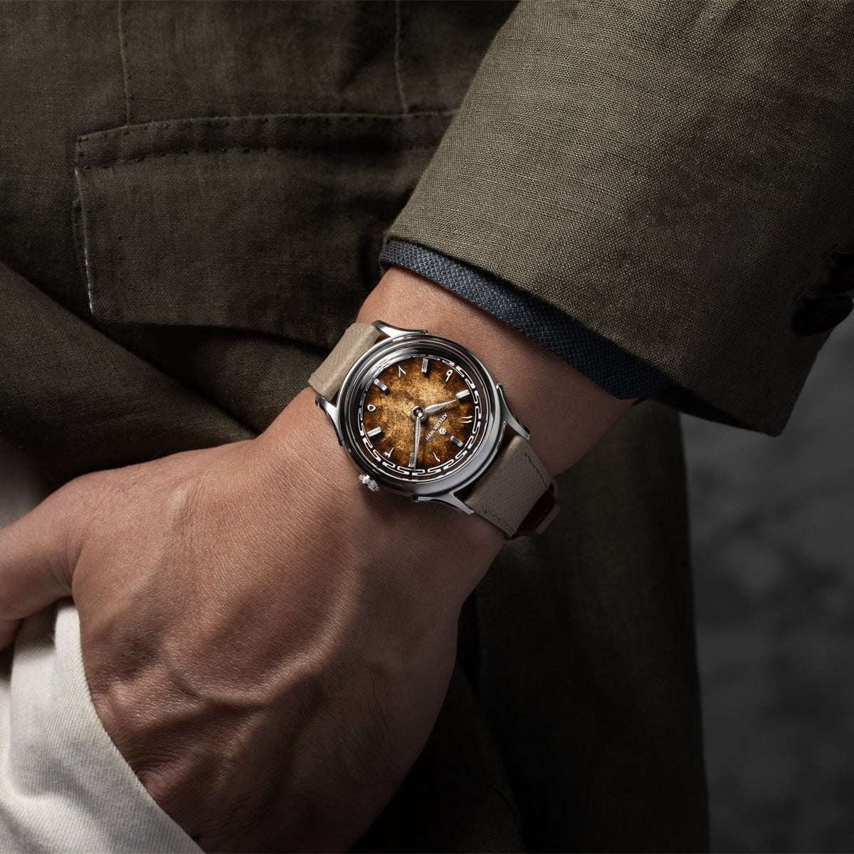 This edition features a stunning fumé grand feu enamel dial, crafted in Beijing by Kong Lingjun. Its gradient shifts from warm desert sand to deep chocolate, achieved through months of experimentation with notoriously difficult brown enamel tones. Beneath it lies a 925 silver gratté-textured base, creating a woven effect evocative of historic silk trade routes. Eastern Arabic numerals and baguette-cut diamond markers add brilliance, while tri-planed rhodium-plated hands catch the light with dynamic reflections.